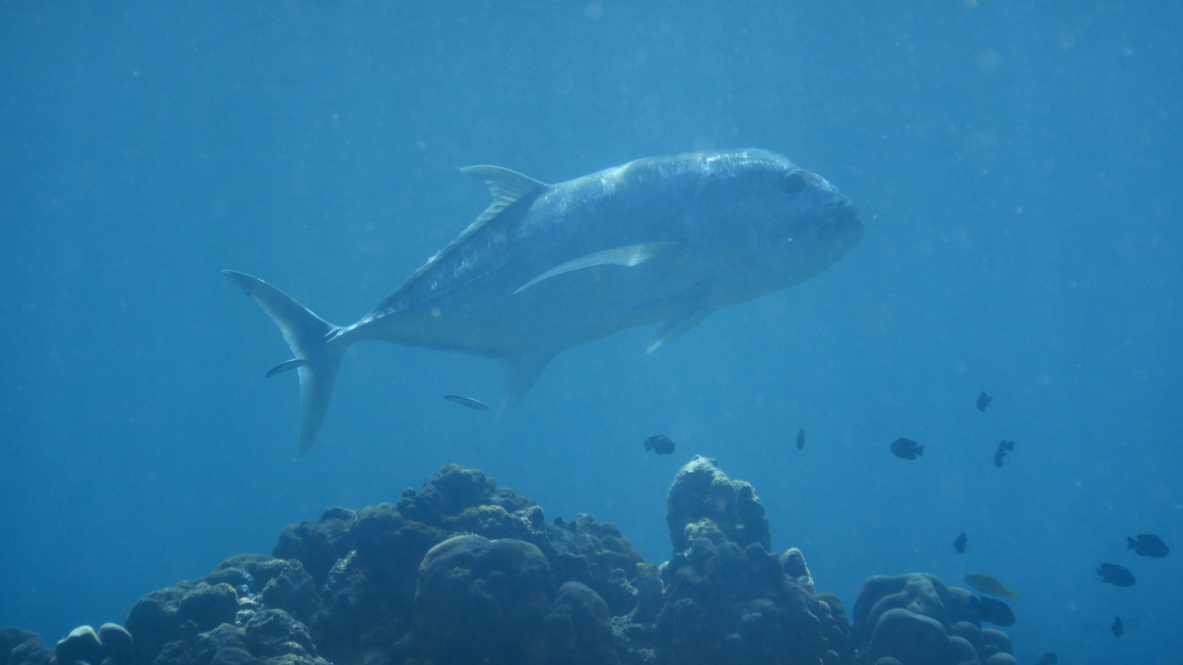 ふと現れるロウニンアジ!珊瑚礁の周りを悠々と泳いでいます。