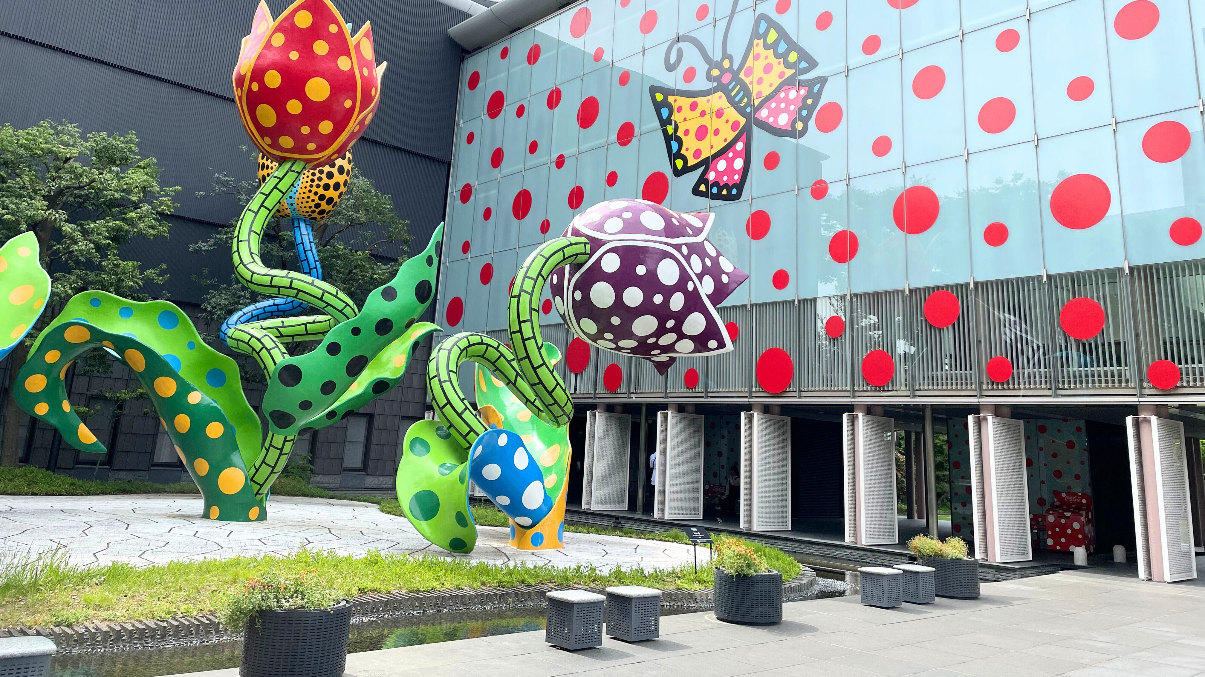 自動販売機からベンチまで、いたるところが赤と白の水玉模様に染まった空間は、歩いているだけでワクワクします!彼女の情熱が伝わってくるような、パワフルで不思議な世界観をぜひ体験してみてください。